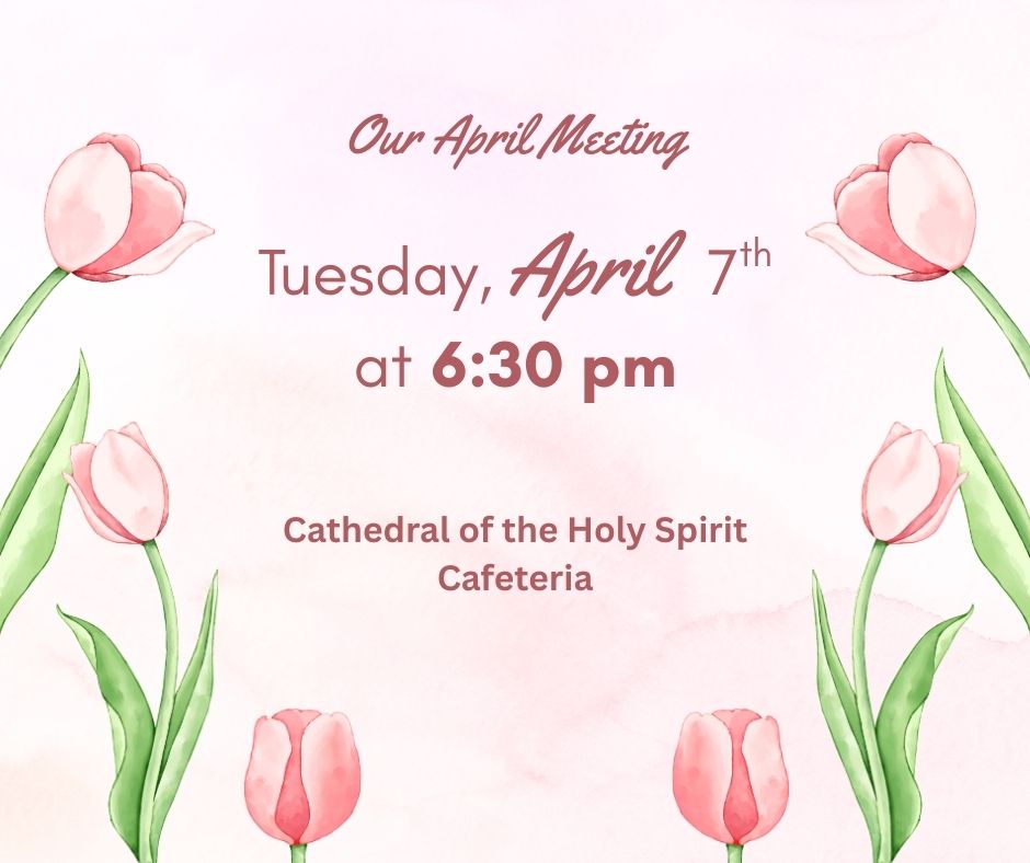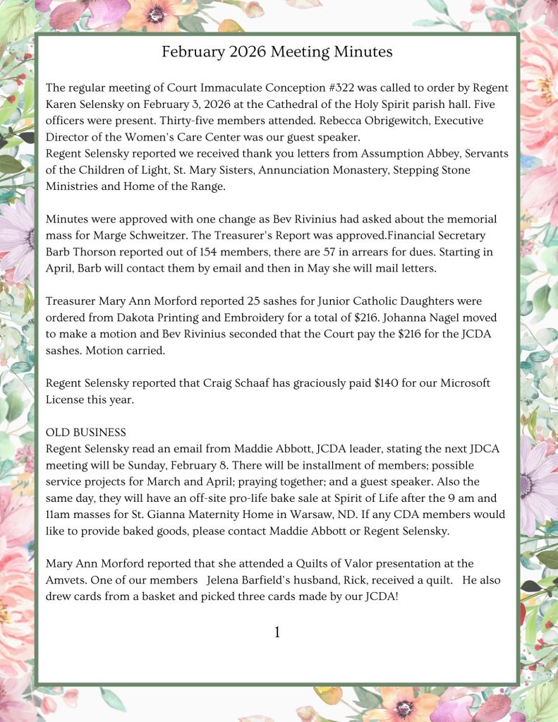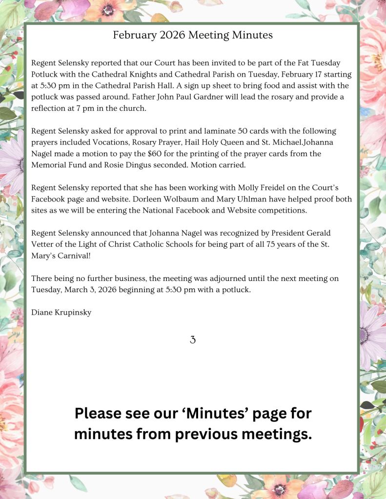 Meetings are held every first Tuesday of the month (except July/August) at the Cathedral of the Holy Spirit cafeteria in Bismarck. Please join us at 6:30 pm when we begin each meeting with the Holy Rosary. All ladies of the Bismarck & Mandan area parishes are welcome to join! Please also feel free to reach out to our current Court Regent, Karen Selensky, with questions (selenskyk@gmail.com).