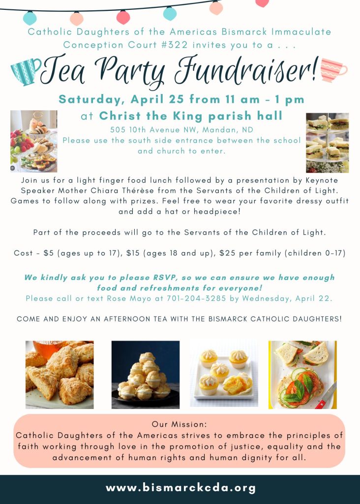 Welcome to the Court website for the Catholic Daughters of Bismarck, North Dakota! We are Court Immaculate Conception #322. Our organization works to promote Catholic morals and principles in our community through fun and engaging activities and events. Find out more about our organization and how to join!