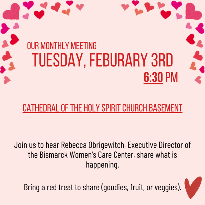 Meetings are held every first Tuesday of the month (except July/August) at the Cathedral of the Holy Spirit cafeteria in Bismarck. Please join us at 6:30 pm when we begin each meeting with the Holy Rosary. All ladies of the Bismarck & Mandan area parishes are welcome to join! Please also feel free to reach out to our current court Regent, Karen Selensky, with questions (selenskyk@gmail.com).